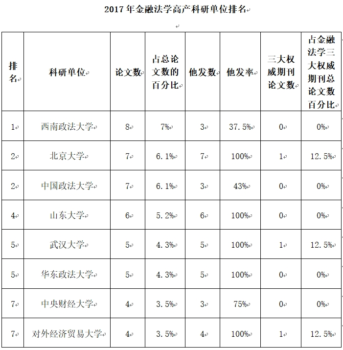 根据2017年金融法核心期刊发文盘点,2017年在法学核心期刊发表的115篇金融服务法学论文的作者来自于55家法学科研机构。其中发表2篇以上(含本数)论文的单位共有22家,其中发表4篇以上的有9家。