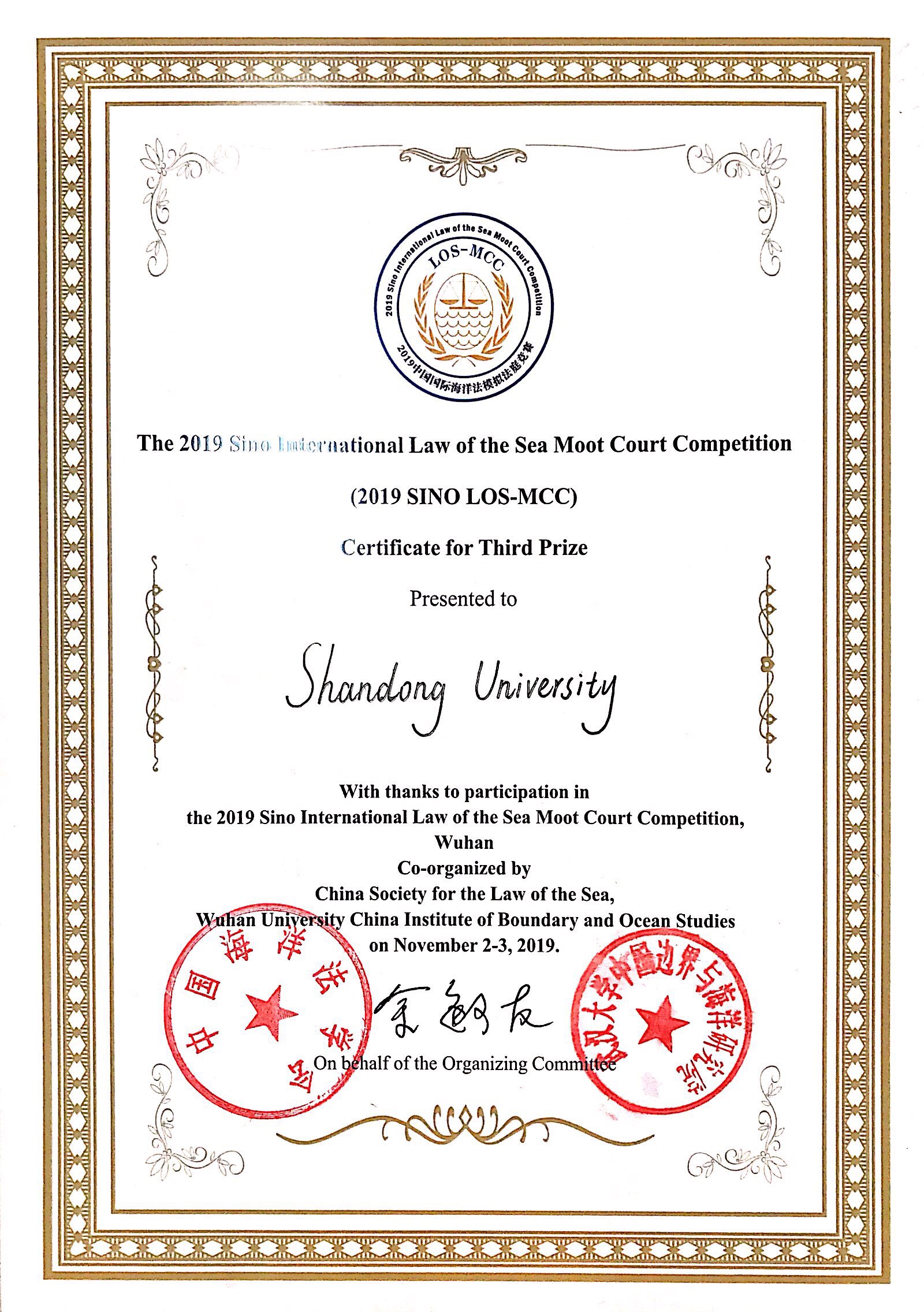 2019年11月2日至3日,由中国海洋法学会和武汉大学中国边界与海洋研究院主办的2019(中国)国际海洋法模拟法庭竞赛在湖北武汉举行。taptap点点体育代表队荣获三等奖。此次参赛代表队由法学与英语双学位班郭晓丹(oralist)、李芮莹(oralist)、谢恩(oralist)、张晓一(oralist)、朱霖徽(researcher)五位同学组成,由taptap点点体育副教授戴宗翰担任教练。