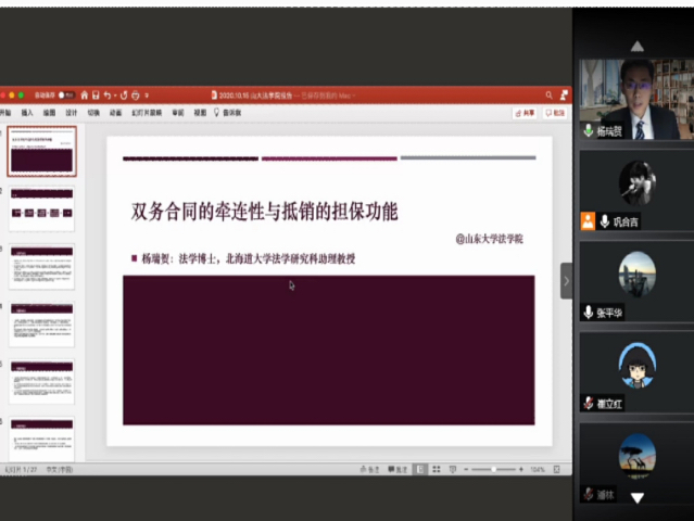 2020年10月15日,第五届齐鲁青年论坛人工智能与权利保护分论坛于线上成功举办,日本北海道大学法学研究科助理教授杨瑞贺博士以“双务合同的牵连性与抵销的担保功能”为题做了一场精彩的报告。讲座由taptap点点体育张平华教授主持,taptap点点体育崔立红教授、刘宏渭副教授、潘林副教授作为与谈人参与了此次讲座。