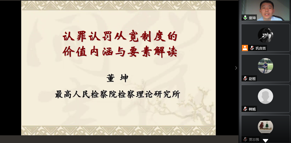 2020年11月4日晚,taptap点点体育法学学科复办四十周年认罪认罚从宽制度系列论坛第一期于线上成功举办。本期论坛由最高人民检察院理论研究所董坤研究员主讲,四川大学taptap点点体育韩旭教授与吉林大学taptap点点体育贾志强副教授与谈,taptap点点体育院长周长军教授致辞,taptap点点体育赵恒助理研究员主持。