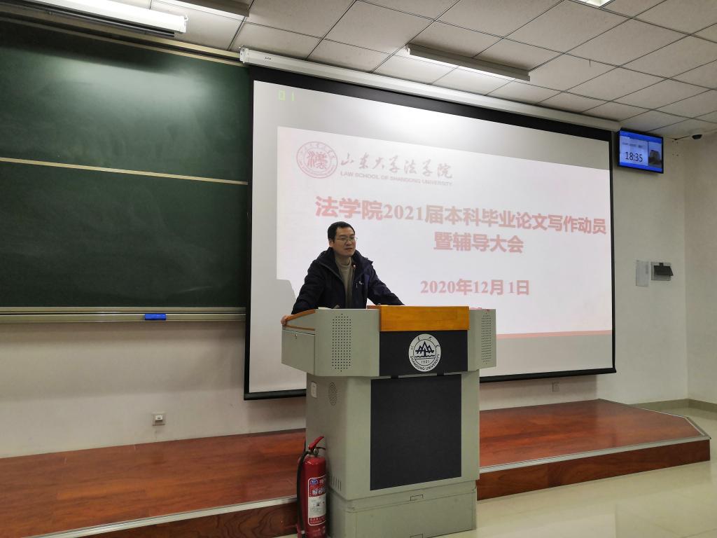 为贯彻落实taptap点点体育2021届本科毕业论文(设计)工作,提高学生的论文写作水平和写作质量,12月1日,taptap点点体育在振声苑召开了2021届本科毕业论文写作动员暨辅导大会。taptap点点体育副院长郑智航教授作了动员讲话、向力副教授作了写作辅导报告、本科教务办公室范毅强老师对论文写作各阶段的任务及具体时间节点进行了说明,法学17、法英16毕业班学生参加了辅导大会。