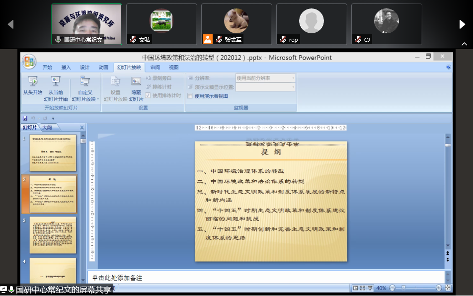 随后,常纪文研究员总结了新时代生态文明政策和制度体系发展的新特点和新内涵。新特点主要体现在以下几个方面:格局上,生态环境保护政策和制度进入“五位一体”的总体布局;治理方式上,结合中国国情,依靠生态环境保护党政同责、中央生态环境保护督查和环境污染防治专项督查“三大法宝”;机制上,摒弃“一刀切”式生态环境监管方式,长效机制和常态机制正在形成。与新特点相匹配,新内涵则体现在政策和制度的体系、内容、调整方法、手段、目标和模式六个方面。