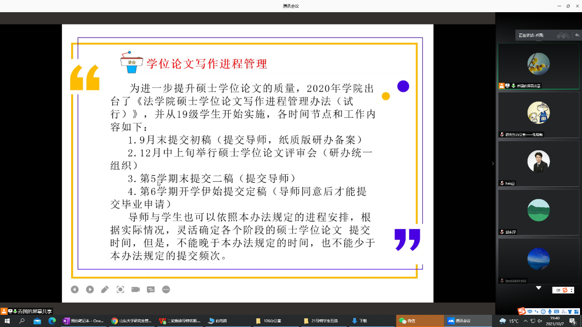 研究生办公室主任乔国对2022年硕士推免复试相关情况、2021级新生与导师双向选择进程、学位授予工作三部分进行了详细说明,重点展示了在学位授予工作中评阅、答辩、学术不端检测三个环节的学校政策解读,以及近年来学院硕士学位论文外审、学术不端检测等方面的问题。强调导师应加强对学生学位论文写作过程的监管与督导,加强对学生学位论文的写作进程管理,以确保硕士研究生按时完成学位论文,进一步提升硕士学位论文的质量。