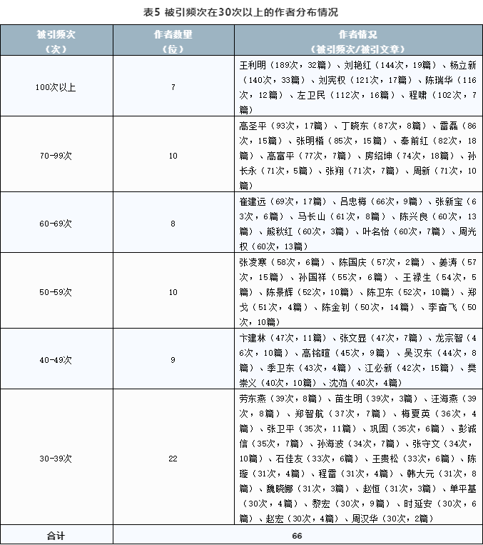 该分析报告以“北大法宝—法学期刊库”作为统计源,选取了196家期刊作为研究对象。高被引作者研究主要从高被引作者的被引频次、被引文章量、所属机构、职称分布以及期刊分布等进行了多维度的深入分析。经统计,2018-2019年被引文章共计6708篇,涉及作者3983位;被引频次30次以上的高被引作者有66位,被引文章622篇,涉及所属研究机构32家。我院郑智航教授被引文章7篇,被引频次37次;赵恒老师被引文章3篇,被引频次31次。