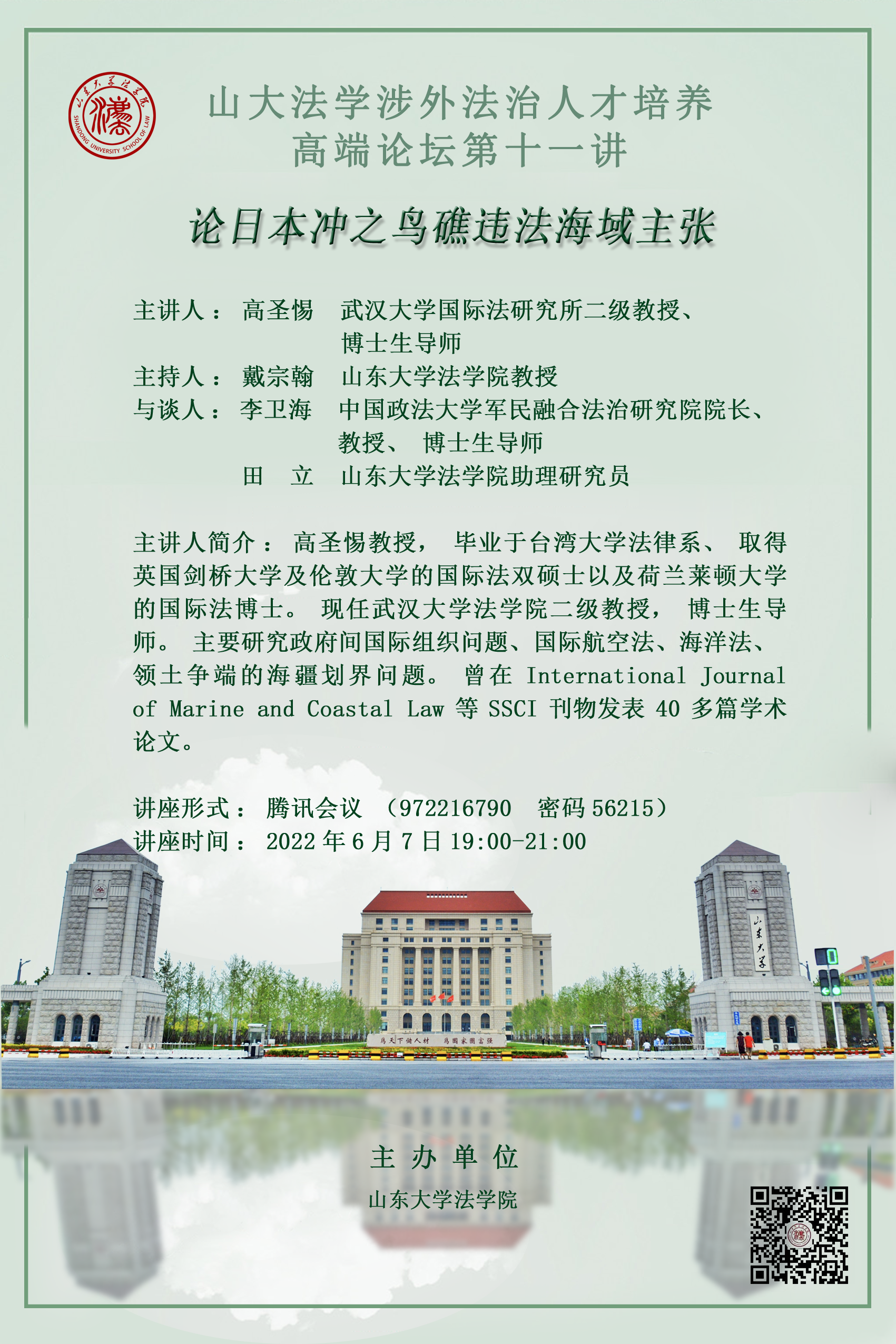 讲座预告 | 山大法学涉外法治人才培养高端论坛第十一讲:论日本冲之鸟礁违法海域主张