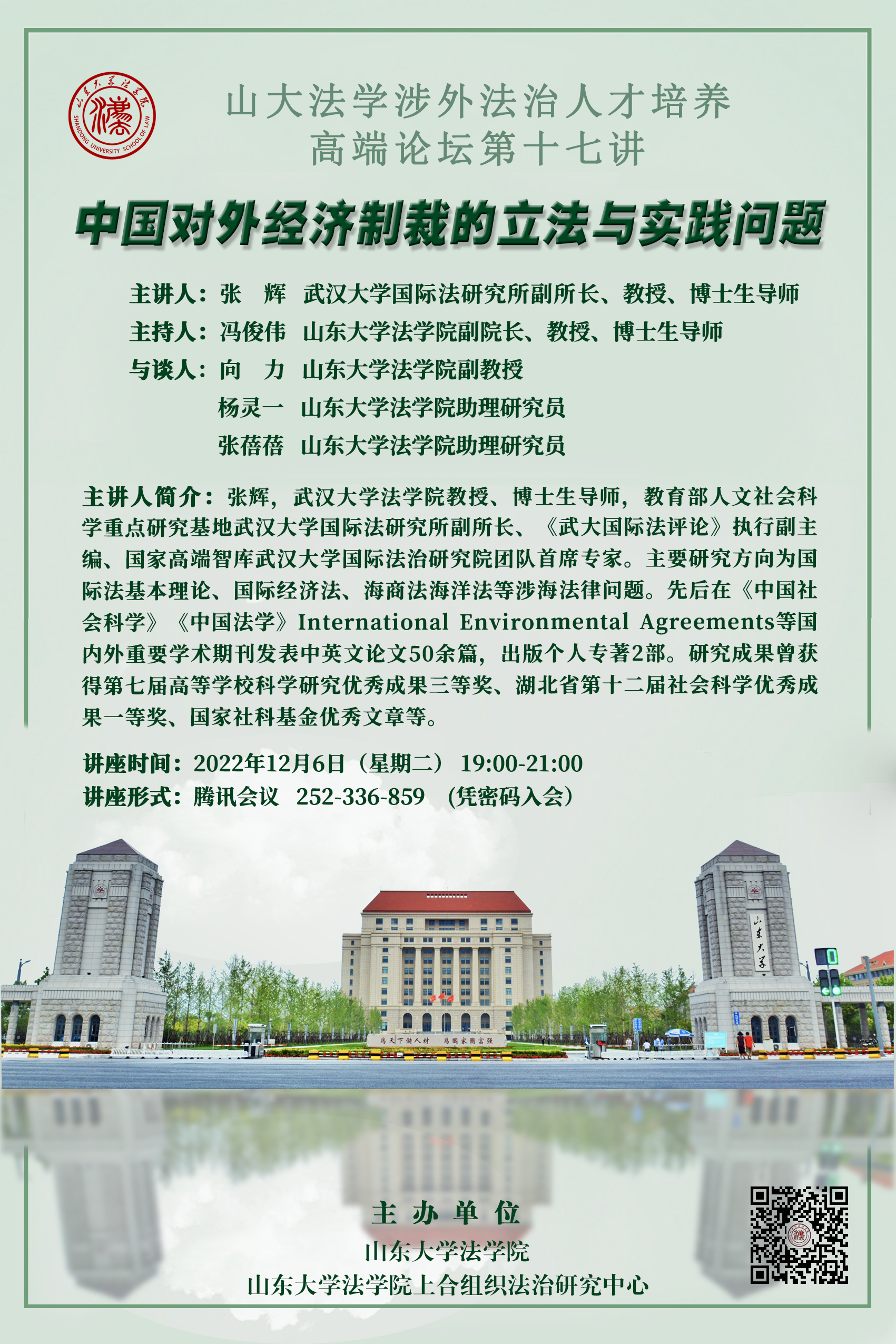 讲座预告 | 山大法学涉外法治人才培养高端论坛第十七讲:中国对外经济制裁的立法与实践问题