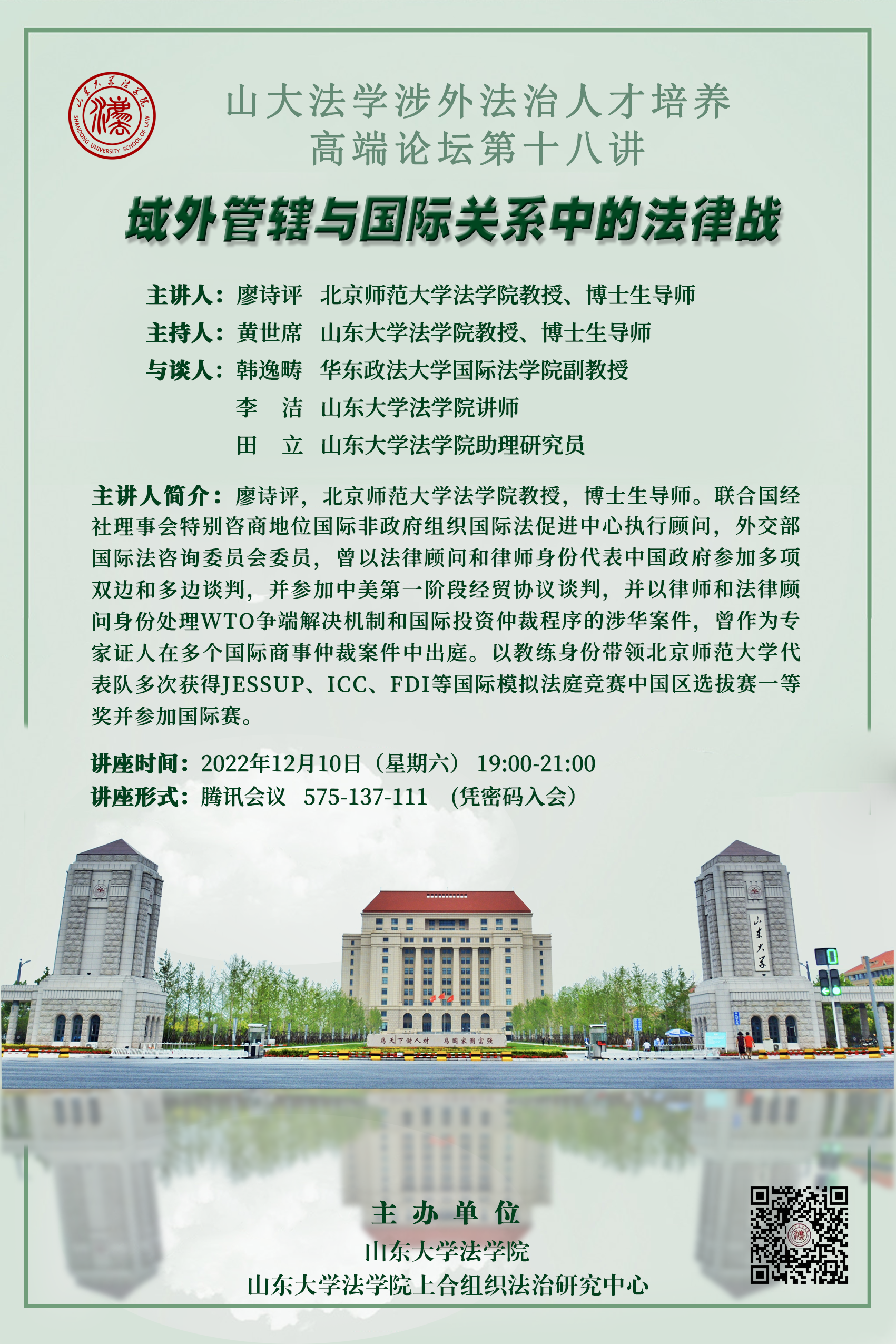 讲座预告 | 山大法学涉外法治人才培养高端论坛第十八讲:域外管辖与国际关系中的法律战