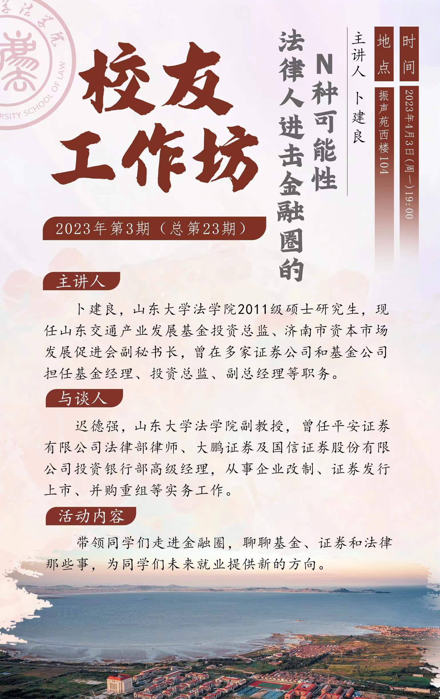 本期活动我们邀请到了山东交通产业发展基金投资总监、济南市资本市场发展促进会副秘书长卜建良,带领同学们走进金融圈,聊聊基金、证券和法律那些事;并与同学们分享他的职业之路,为同学们未来的就业提供新的选择。感兴趣的你,赶紧报名参与吧!