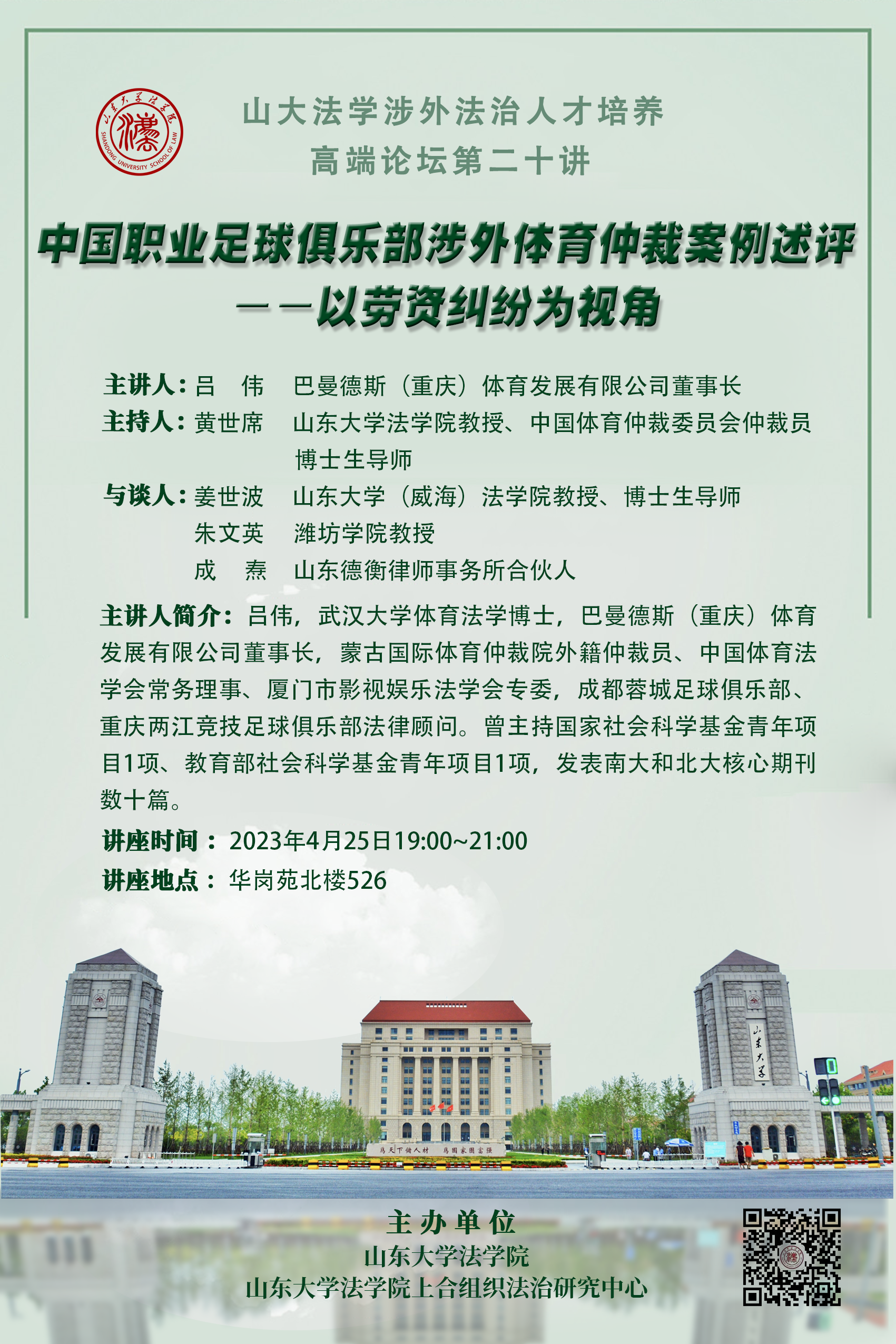 讲座预告 | 山大法学涉外法治人才培养高端论坛第二十讲:中国职业足球俱乐部涉外体育仲裁案例述评——以劳资纠纷为视角