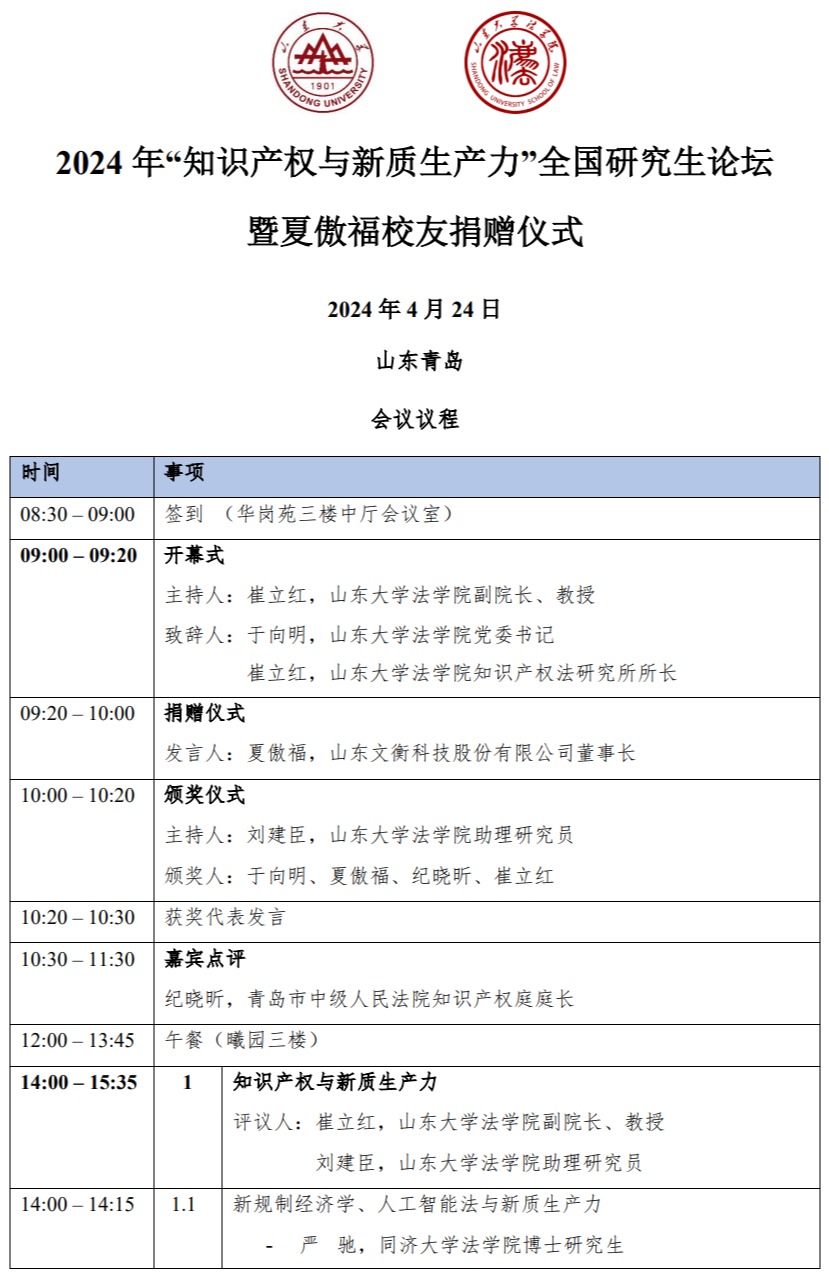 会议议程 | 2024 年“知识产权与新质生产力”全国研究生论坛暨夏傲福校友捐赠仪式