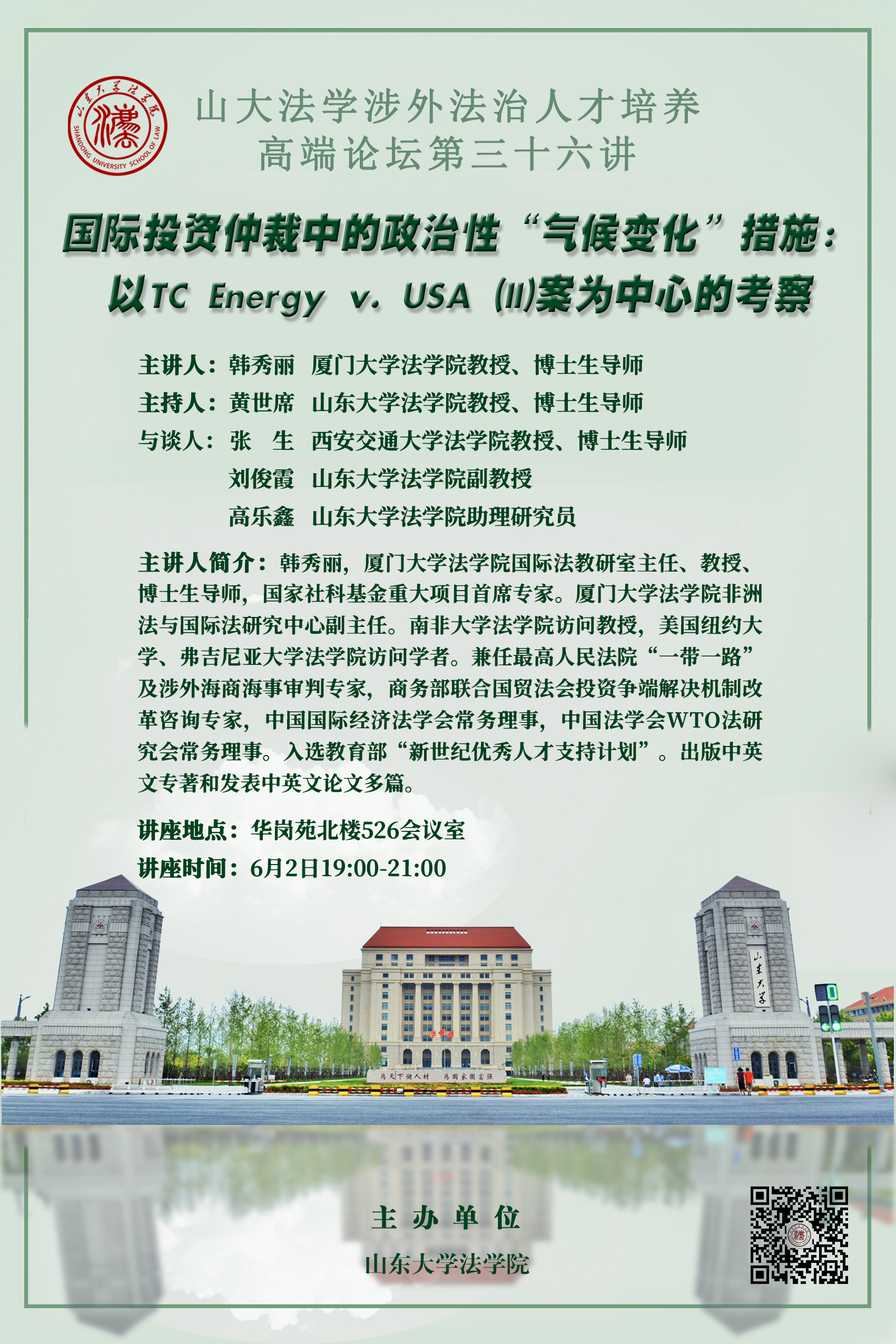讲座预告 | 山大法学涉外法治人才培养高端论坛第三十六讲——国际投资仲裁中的政治性“气候变化”措施:以TC Energy v.USA (II)案为中心的考察