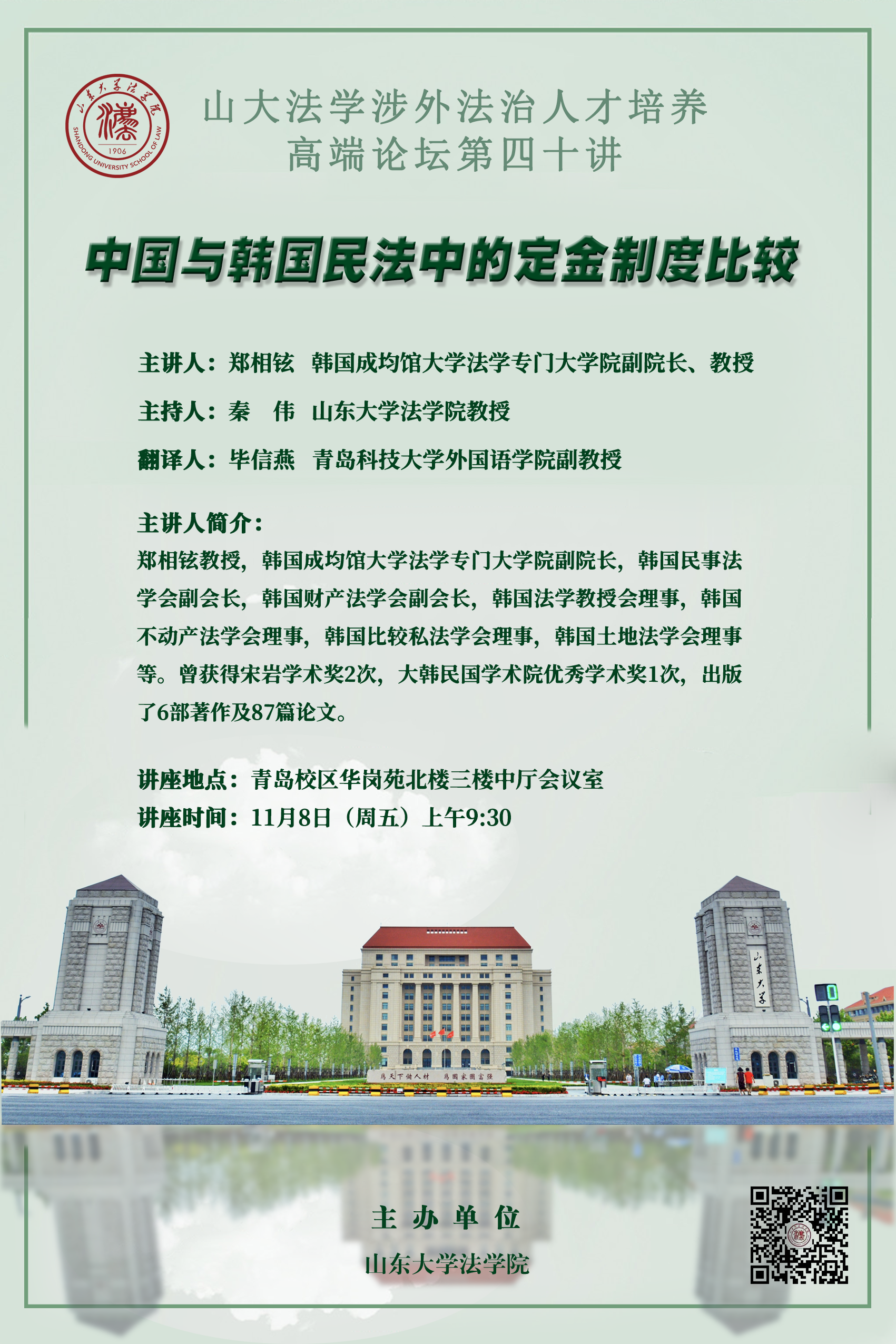 讲座预告 | 山大法学涉外法治人才培养高端论坛第四十讲:中国与韩国民法中的定金制度比较