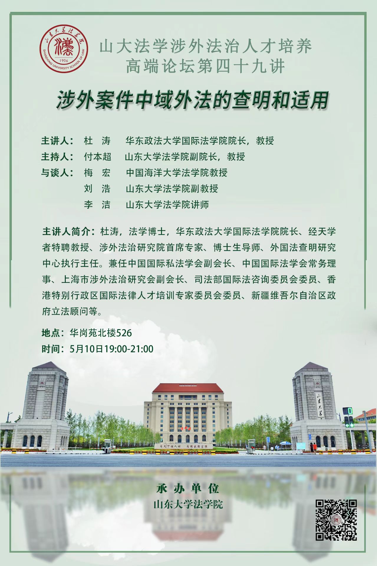 讲座预告|山大法学涉外法治人才培养高端论坛第四十九讲:涉外案件中域外法的查明和适用