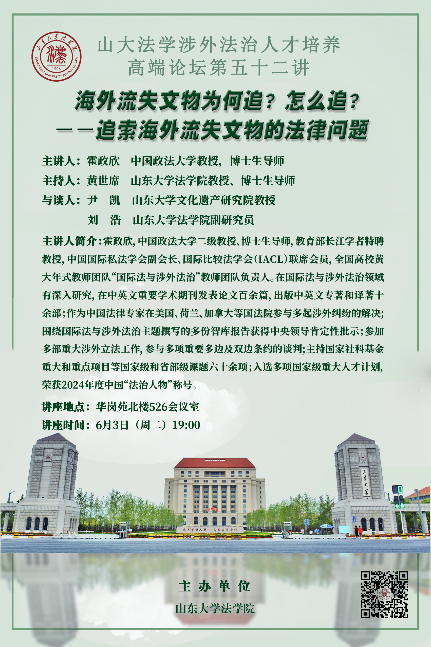 讲座预告 | 山大法学涉外法治人才培养高端论坛第五十二讲:海外流失文物为何追?怎么追?--追索海外流失文物的法律问题