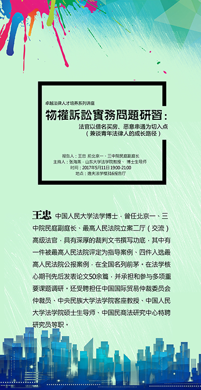 5.11卓越法律人才培养系列讲座预告|王忠:物权诉讼实务问题研究:法官以借名买房、恶意串通为切入点(兼谈青年法律人的成长路径)