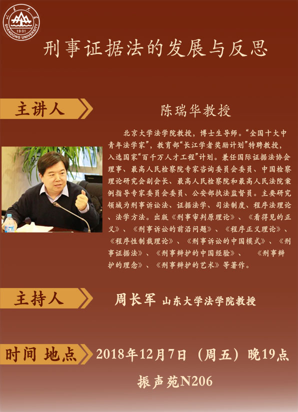 主讲人简介:陈瑞华,北京大学法学教授,博士生导师。“全国十大中青年法学家”,教育部“长江学者奖励计划”特聘教授,入选国家“百千万人才工程”计划。兼任国际证据法协会理事、最高人民检察院专家咨询委员会委员、中国检察理论研究会副会长、最高人民检察院和最高人民法院案例指导专家委员会委员、公安部执法监督员。主要研究领域为刑事诉讼法、证据法学、司法制度、程序法理论、法学方法。出版《刑事审判原理论》、《看得见的正义》、《刑事诉讼的前沿问题》、《程序正义理论》、《程序性制裁理论》、《刑事诉讼的中国模式》、《刑事证据法》、《刑事辩护的中国经验》、《刑事辩护的理念》、《刑事辩护的艺术》等著作。
