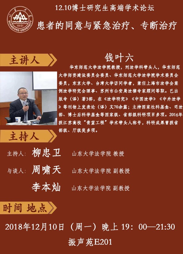 12.10 博士研究生高端学术论坛:患者的同意与紧急治疗、专断治疗