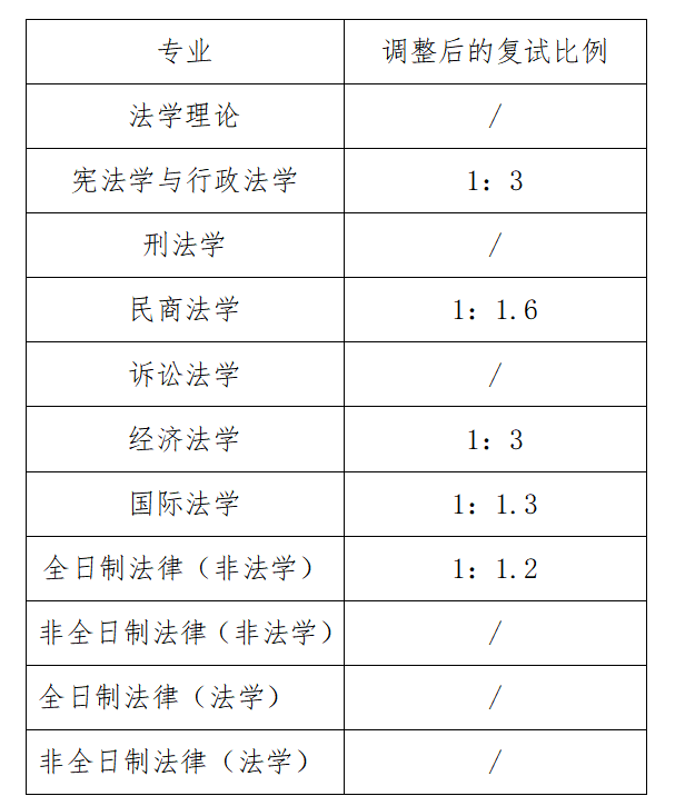 所有参加学院复试的考生须满足学校规定的各个专业进入复试的基本要求(分数线),其中宪法学与行政法学、民商法学、经济法学、国际法学、全日制法律(非法学)专业进行了复试比的调整。复试人数不是整数的,按照四舍五入方式计算;处于临界点的考生初试总分一样的,全部进入复试名单。