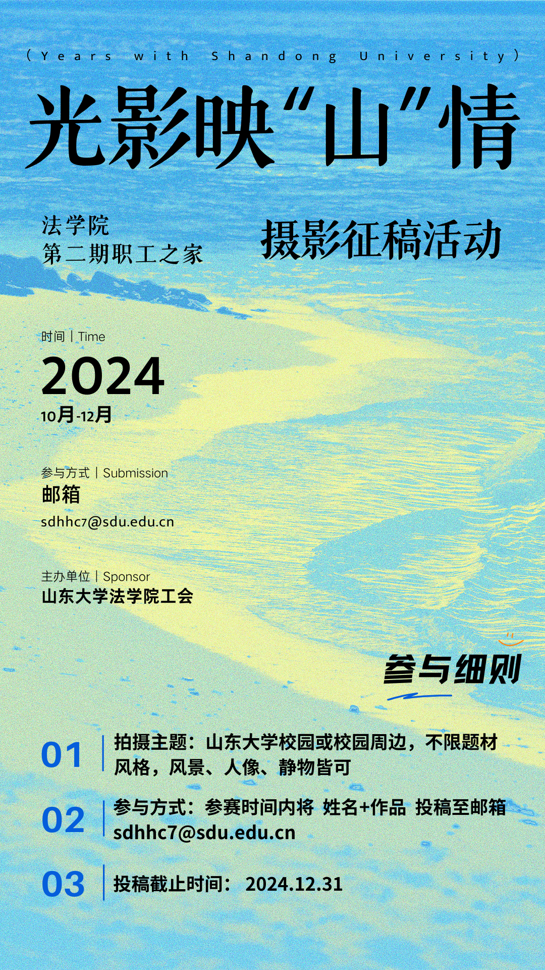在此我们诚挚的邀请您,参与【第二期职工之家摄影征稿活动】,通过镜头里的光影诉说与山大的难忘时刻。(具体参与细则参见海报)
