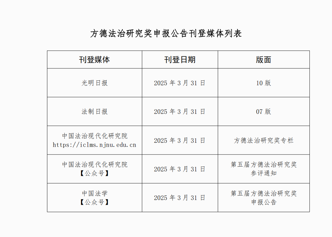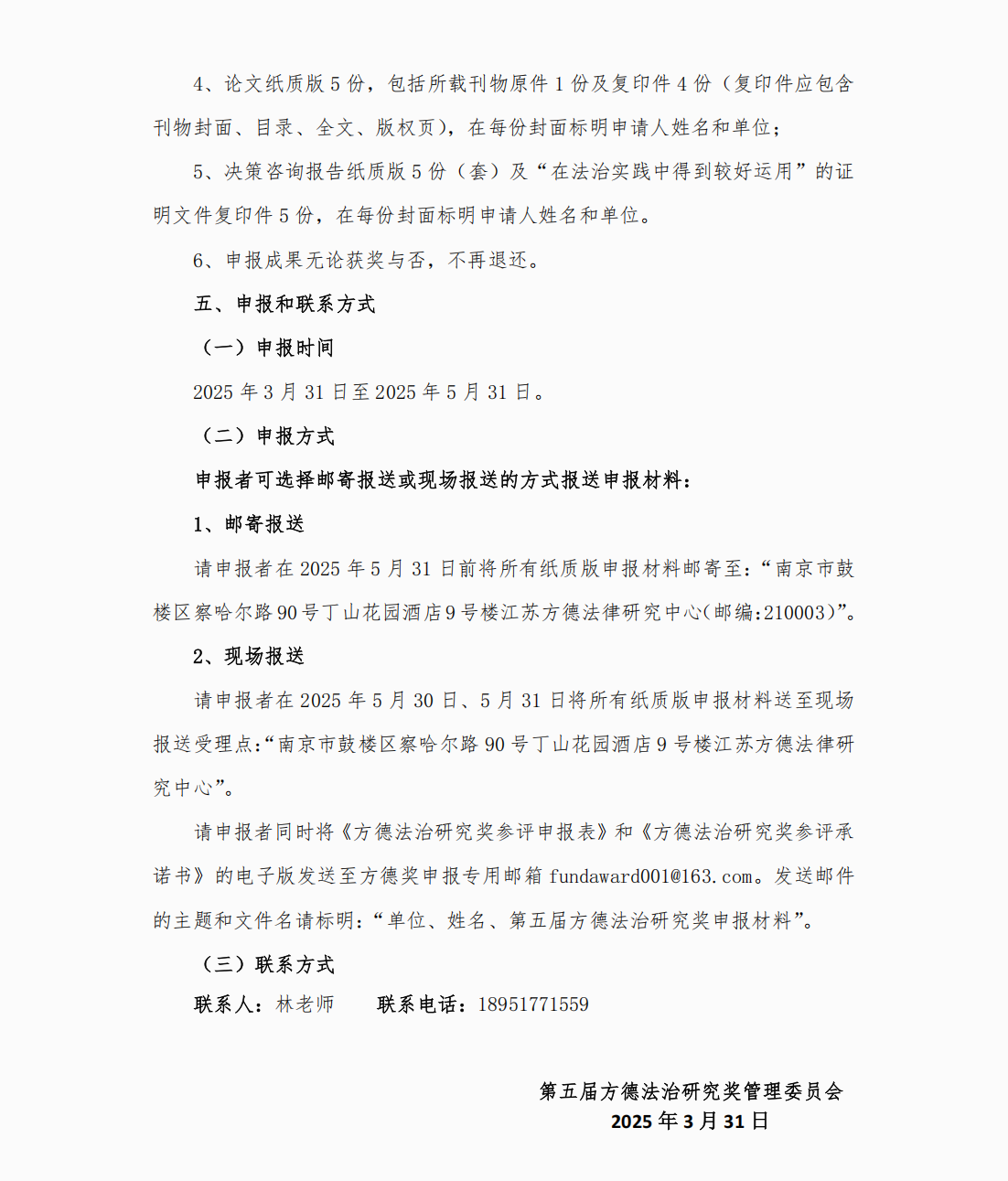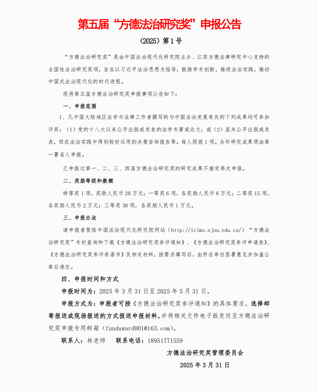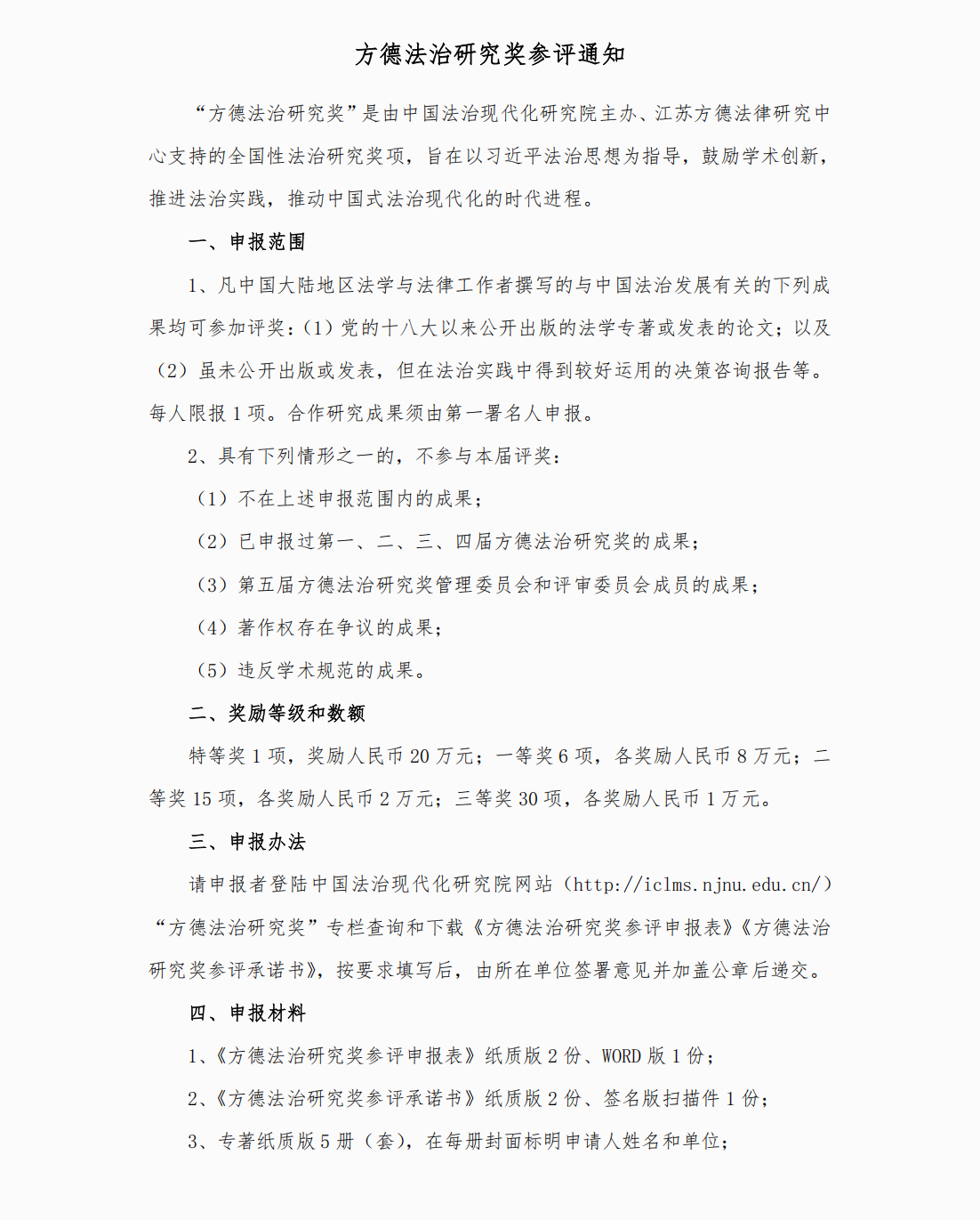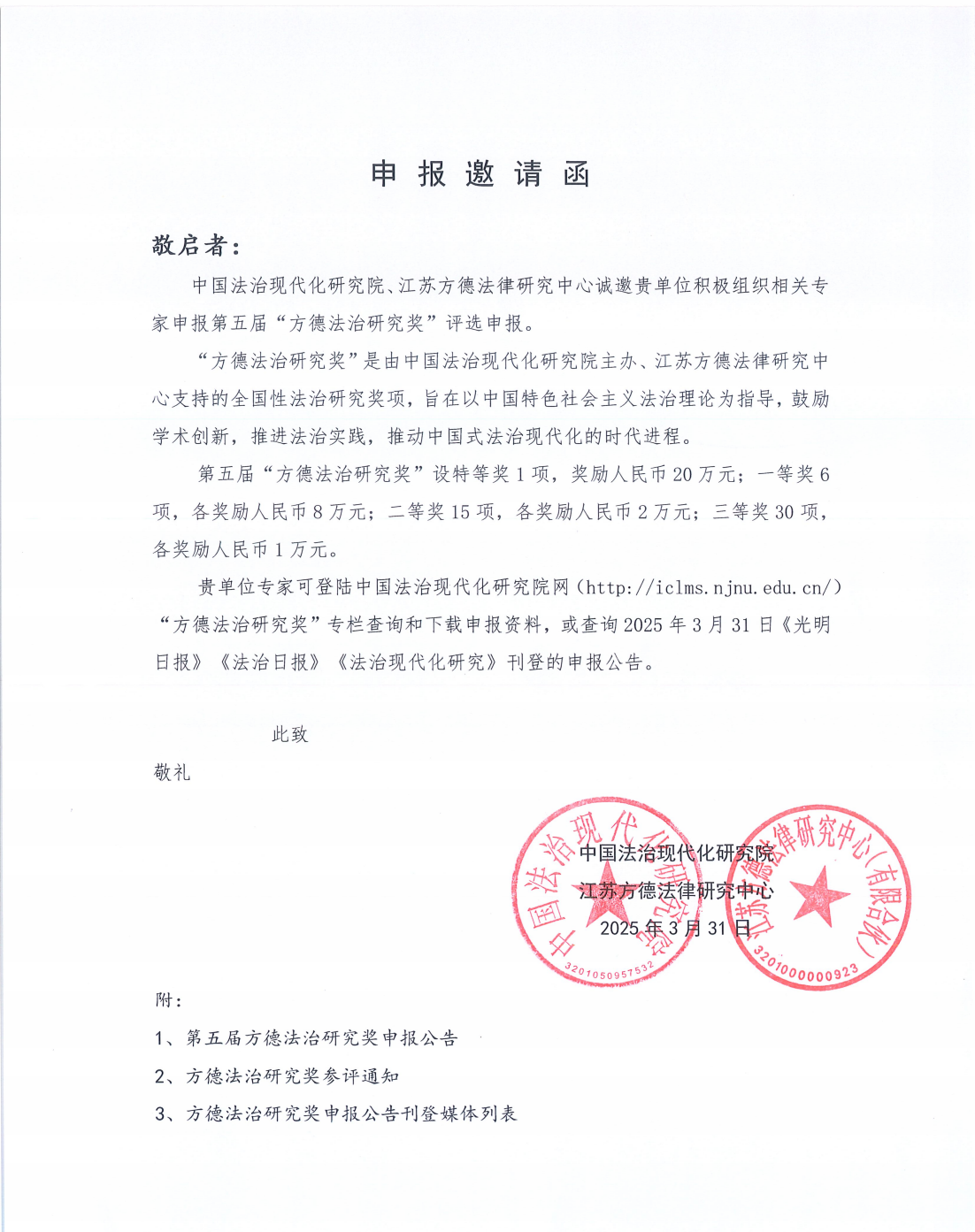 第五届方德法治研究奖申报邀请函(附申报公告、参评通知)