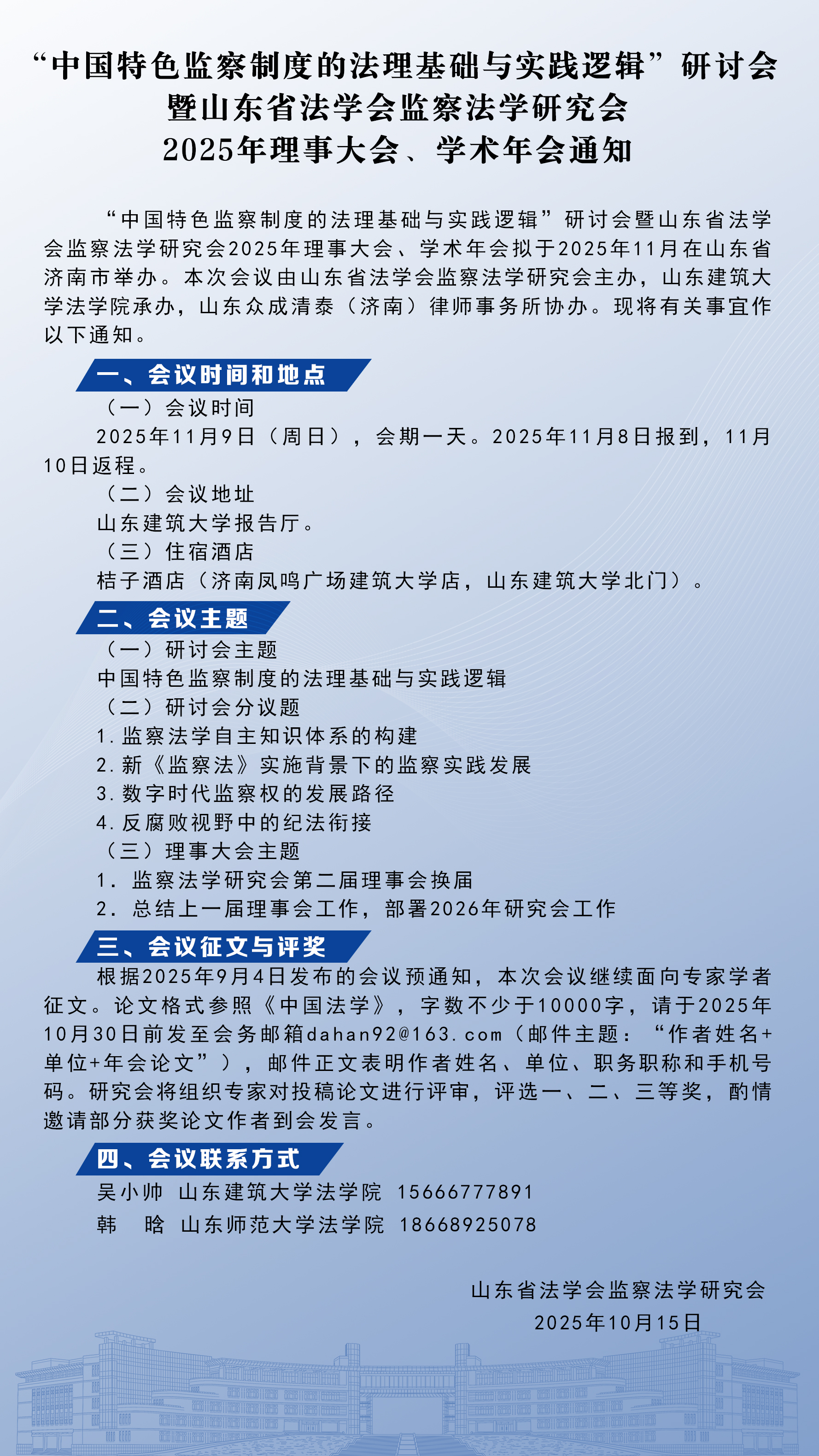 “中国特色监察制度的法理基础与实践逻辑”研讨会暨山东省法学会监察法学研究会2025年理事大会、学术年会通知