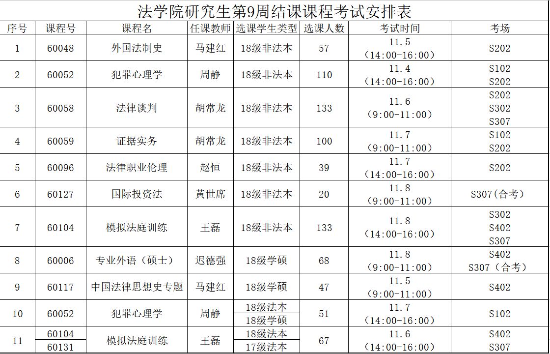 taptap点点体育2019-2020第一学期的研究生1-9周课程即将结束。按照计划,以“考试”作为结课考核形式的,考试会在第10周集中进行。现将安排公布如下(附件中有11门课程详细的选课名单及考场安排):