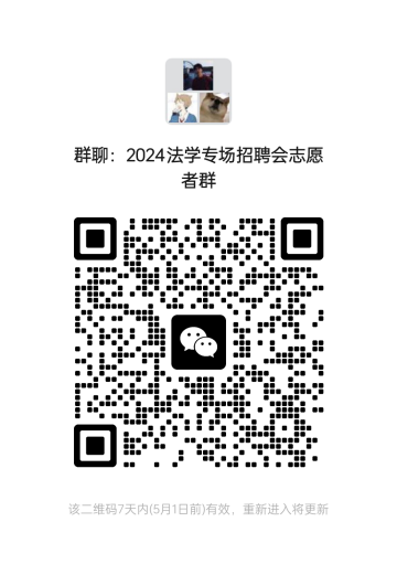 请以上同学实名加入“2024法学专场招聘会志愿者群”,后续相关通知将在群内发布,微信群二维码如图: