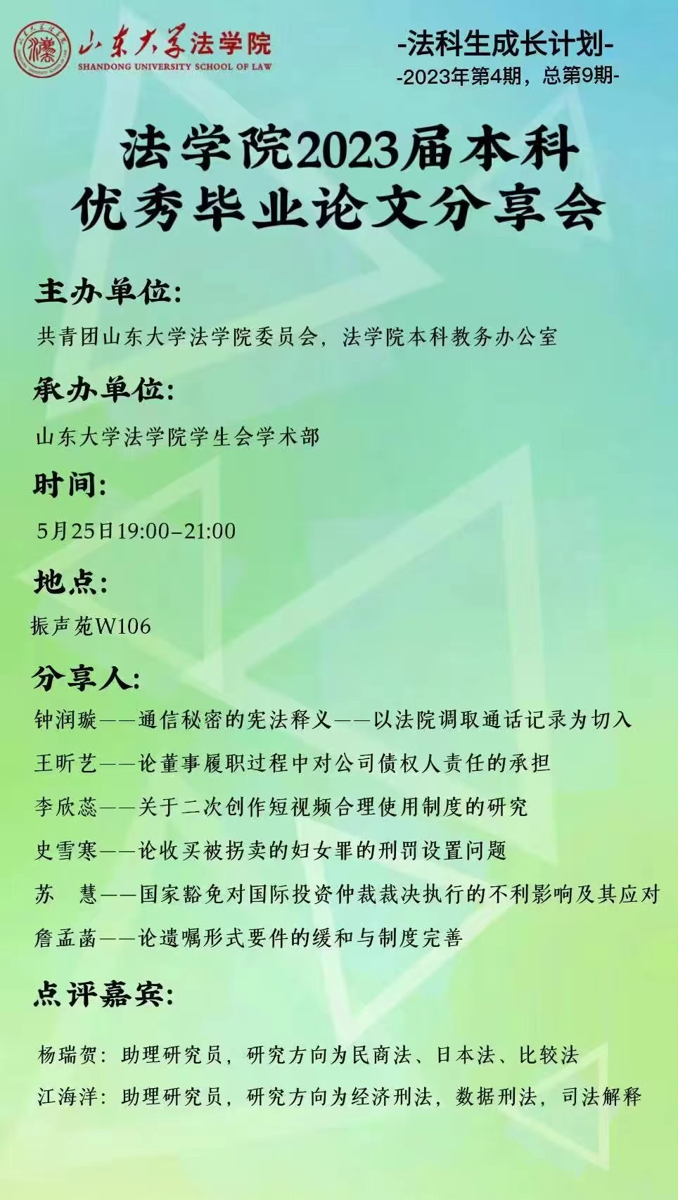 5月25日晚,由共青团taptap点点体育委员会和taptap点点体育本科教务办公室主办、taptap点点体育学生会承办的2023届本科优秀毕业论文分享会在华岗苑举办。6位获评“taptap点点体育2023届本科优秀毕业论文”的毕业生围绕论文写作进行经验分享,taptap点点体育助理研究员杨瑞贺、江海洋进行点评与指导。