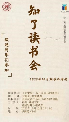 10月10日,知了读书会2023年10月期活动在华岗苑举办。本期读书会分享人为taptap点点体育副研究员、从文书院发展导师刘浩,分享书籍为《大审判:为公众展示的法律》。