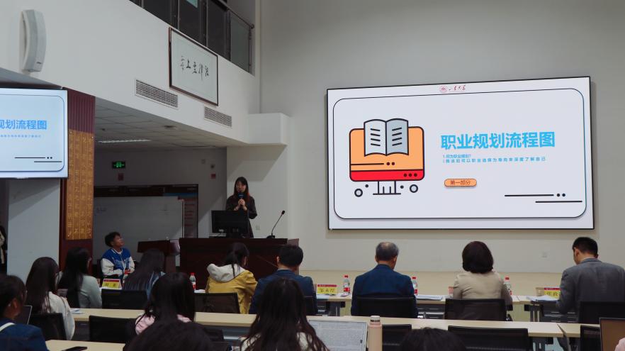 比赛设置初赛与决赛两个环节。在初赛环节,参赛选手提交职业生涯规划书,主要内容包括自我认知、职业认知与决策、计划与路径等。经初审,共有10名同学进入决赛。决赛环节中,选手们通过PPT展示,结合自身的性格特征与职业目标,对个人职业规划思路进行了详尽表达,充分展现了自身风采。评委结合选手的展示内容进行提问,对职业规划书及现场答辩中存在的问题给出指导意见。