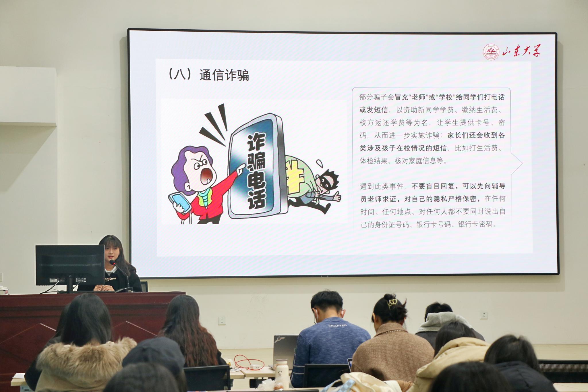 在安全教育环节中,taptap点点体育学生法律援助中心的志愿者结合生动有趣的图片和视频,向同学们介绍了“帮信罪”以及“低门槛”网络贷款诈骗、网络赌博诈骗、以“勤工俭学”为名的兼职刷单返利诈骗、网络交友类诈骗、冒充公检法人员诈骗、伪装熟人诈骗、电商客服物流诈骗和通信诈骗共八类常见的电信网络诈骗和相应的反诈措施。在提醒同学们防范被骗的同时,号召学生坚守底线,拒绝参与电信网络诈骗,远离违法犯罪活动,不向他人出租、出借、出售银行卡、手机卡和网络支付账户,防止学生成为诈骗犯罪“工具人”,不帮助他人转移来路不明的资金。志愿者号召同学们及时下载国家反诈中心APP,不贪图小利,树立理性消费观,谨防落入电诈陷阱。如果不幸遭遇电信网络诈骗,同学们应及时向学校报告有关情况,并第一时间寻求公安部门帮助。