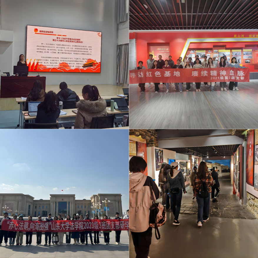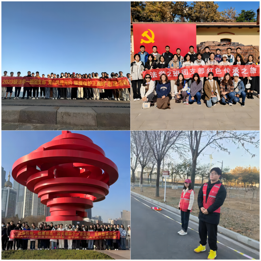 围绕“理论学习”主题,2022级法律硕士(非法学)二班团支部以“青春·使命·担当”为主线,开展专题理论学习。团支部着眼于理论联系实际的要求,运用主题团课、专题演讲、观看录影、撰写心得笔记等多种方式促学;2022级法律硕士(非法学)一班团支部以“交流研讨展风采,活动促学树新风”为主题,立足支部成员实际情况,以“思之悟之,行之践之”为目标,开展线上线下学习交流、党团知识趣味游戏和红歌合唱等形式丰富的团日活动。在“实践体验”主题,2021级法学与英语双学位班团支部、2022级法学二班团支部、2023级法学二班团支部、2023级法学三班团支部、2023级中日经贸法律特色班团支部结合校内外红色资源,于鳌角石党史馆、青岛党史纪念馆、海军博物馆、青岛市革命烈士纪念馆和五四广场等地参观学习,在实践中感悟红色精神。在“青春建功”主题,2022级法学三班团支部组织开展了“校园微公交”志愿服务先锋岗等系列“张三”品牌志愿公益活动,结合专业特色,深化青年学生的社会责任感;2023级法学一班团支部开展净滩志愿服务和线上海洋环保宣传,增强同学们的环境保护意识;学生法学社团支部组织进行了多次团课理论学习,开展“宪法知识知多少”答题闯关、宪法知识竞赛等系列实践活动,将法学学科理论与实践相结合,推动法治校园建设。