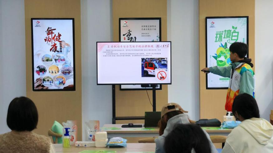 随后,志愿团队成员2023级本科生袁甫航为居民们带来健康法律知识宣讲,他以生活中的法律体现为引,阐明法律对于卫生健康的重要保障意义,并列举相关法条和法律案例,具体讲述了日常容易遇到的卫生健康问题以及法律解决途径,鼓励社区居民提高健康风险防范意识。