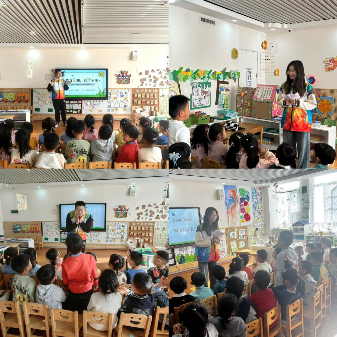 班级同学通过法律小课堂的形式,在幼儿园中开展普法宣传活动。授课同学通过“班规”与“园规”,引导幼儿了解“法律”这一概念,并以生动活泼的话剧展现法律职业的特点。同时,授课同学依托“森林法庭”这一形象化的比喻,帮助幼儿初步认知“人民法院”“开庭”等概念。在互动环节中,小朋友们纷纷举手发言,积极分享感悟,课堂气氛活跃温馨。