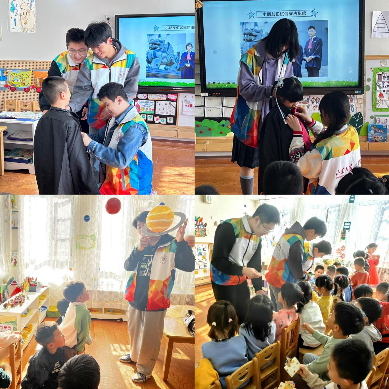 授课结束后,班级同学帮助幼儿试穿法袍,引领幼儿体验法律的公正与威严。60余名幼儿依次穿上法袍,并在班级同学的引导下,尝试从法律角度出发思考生活中的常见问题。随后,班级同学结合幼儿的心理特点,采用分发贺卡、做游戏、讲故事的形式,进一步强化其对法律的感知。