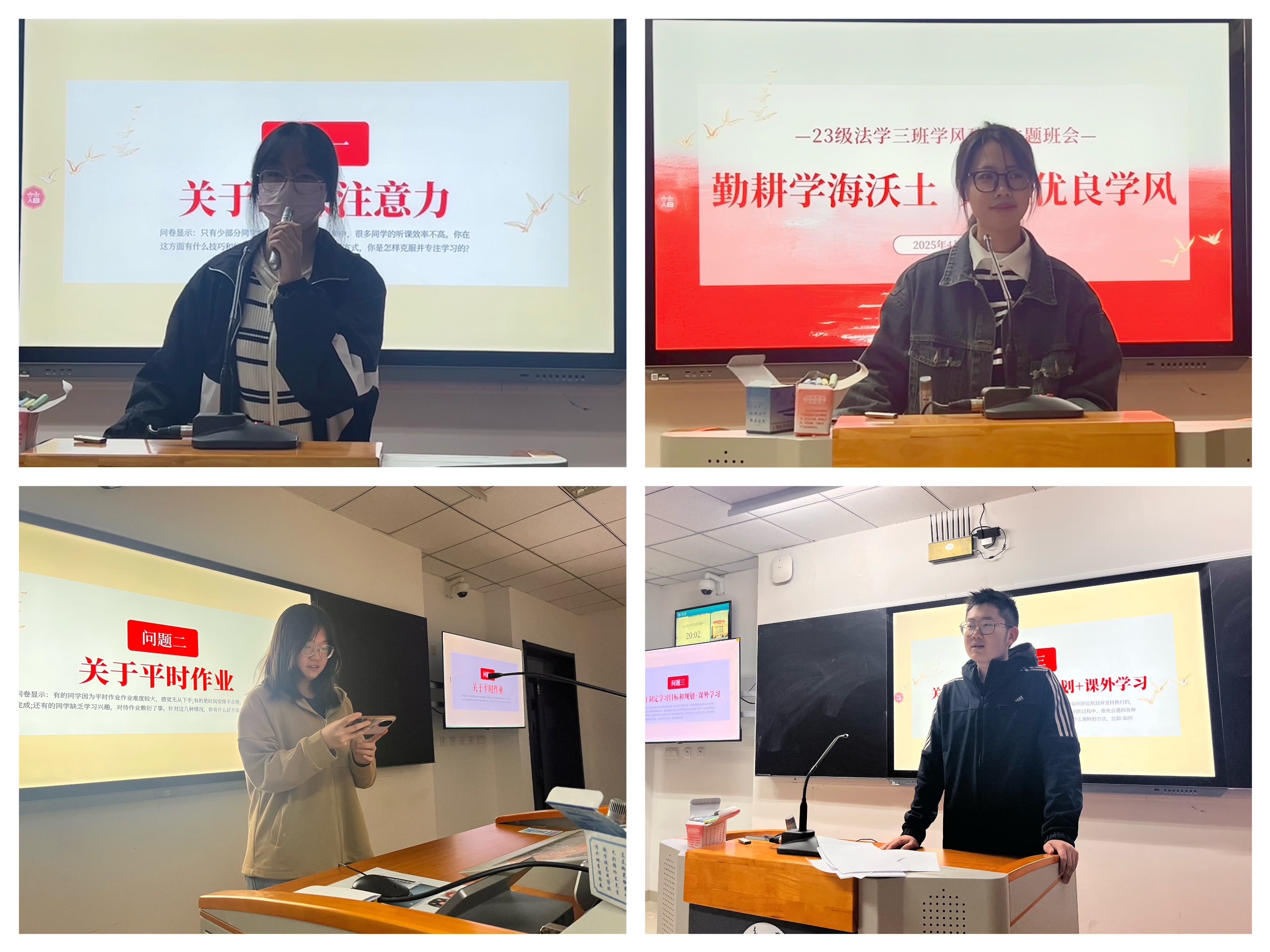 为增强班级学风建设、解决班级同学学习难题,2023级法学三班召开了学风建设主题班会。根据班干部前期问卷调研,本次班会围绕同学提出的三方面问题展开,邀请了五位同学分享相关学习经验,为同学们答疑解惑。