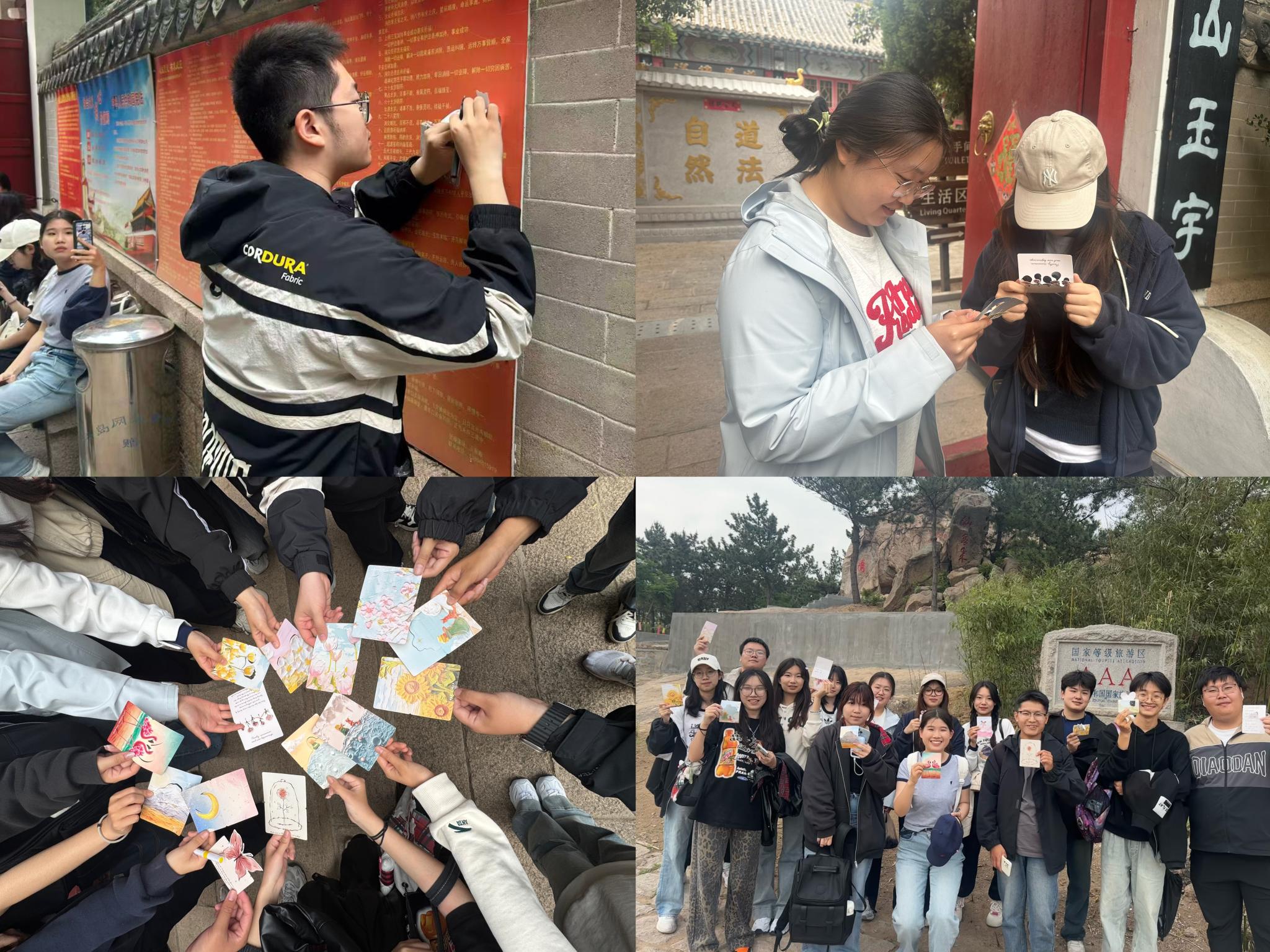 在鹤山风景区,同学们沿着山路依次探访“招鹤回鸣”“水鸣天梯”等景点,在游览过程中近距离感受巍峨群峰的壮美、山清水秀的魅力。同时,班级特别安排了心理健康教育环节。通过“互换明信片”的互动游戏,同学们以匿名方式分享心事、传递祝福,在与大自然的密切接触过程中有效释放内心压力、获取积极能量,也为本次集体活动创造了温馨、喜悦的氛围。