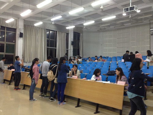 晚6时,学生会主席、副主席、各部部长及准时到达讲学堂105。学生会主席王尧志随即召开了简短的纳新工作会议,说明纳新流程以及相关注意事项,并迅速安排好场地与人员,为纳新工作的展开做好了准备。