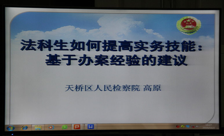 高原检察官从四个角度对“法科生如何提高实务技能”这一主题进行了阐述:首先,阐述了侦查监督科的职责,包括审查逮捕、刑事立案监督以及侦查活动监督,同时,在实践中总结出逮捕条件细化审查表,将逮捕的各项条件细化在一张表格上,实现了审查逮捕工作的精细化和规范化。其次,讲解了检察院日常工作主要适用的相关法律法规,主要包括《刑事诉讼法》第79条与《最高人民检察院关于在检察工作中贯彻宽严相济刑事司法政策的若干意见》。再者,通过在检察院工作中的具体案例对办案流程与参考的相关法律法规进行解释,提出在办案过程中需要形成证据链,所以在校期间要加强证据学知识的学习。最后,高原提到应该加强普法工作的力度,提高公民的法律意识与法律素养,为法治社会与法治国家的建设提供良好的社会环境。