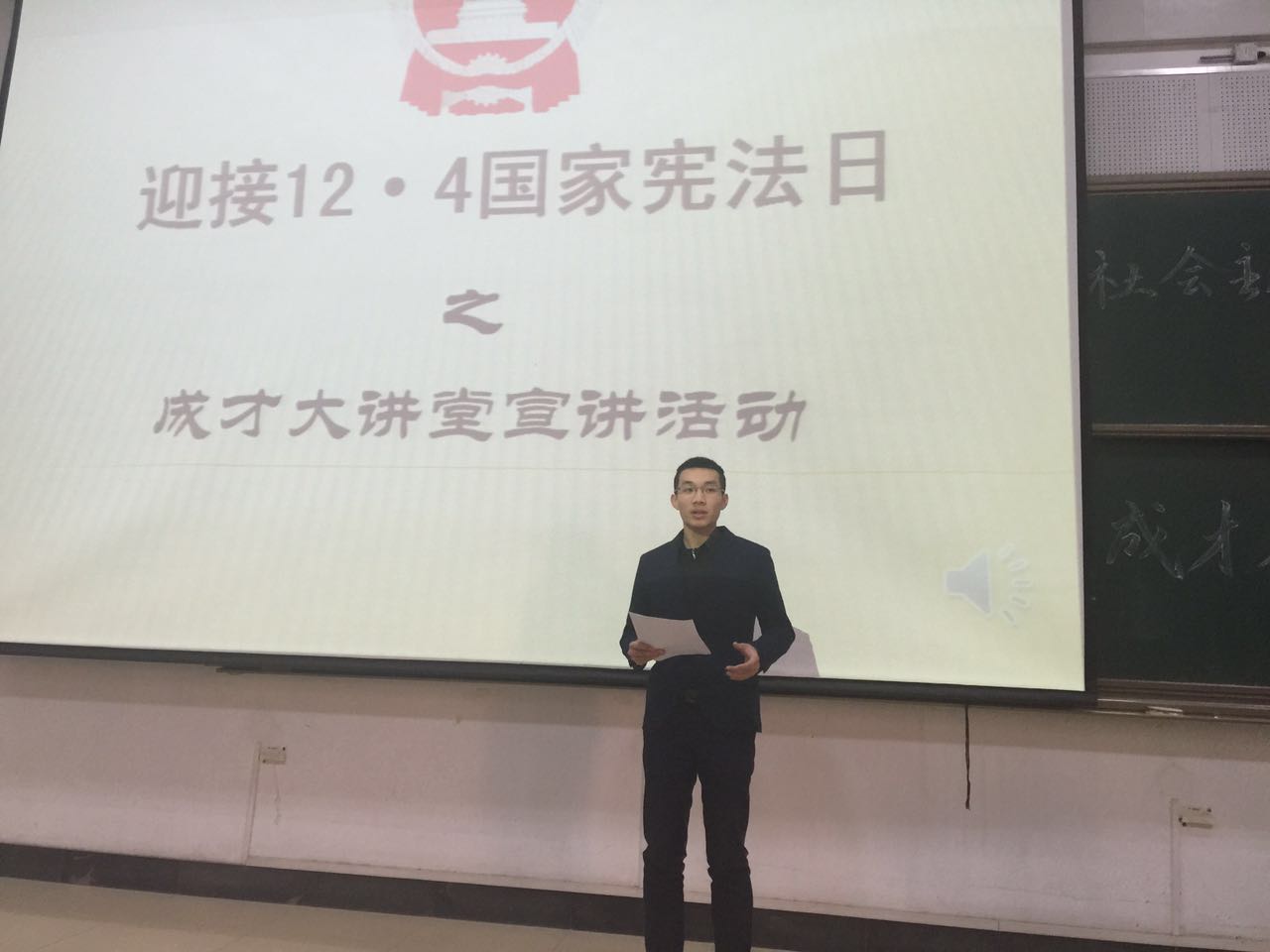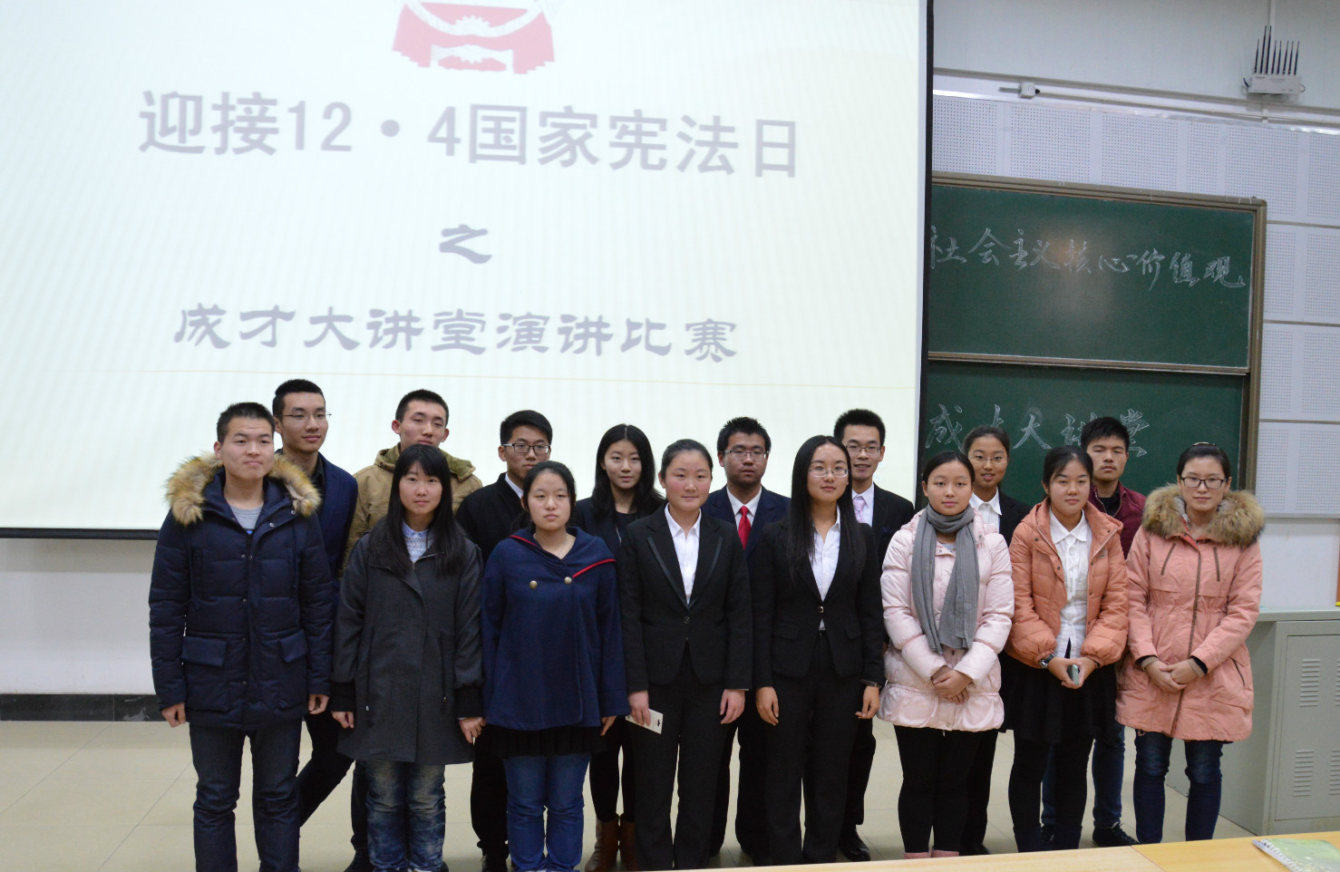 123日下午,以“迎接12·4国家宪法日”与“弘扬和践行社会主义核心价值观”为主题的成才大讲堂活动在兴隆山校区讲学堂203举行。本次活动得到了taptap点点体育2015级全体本科新生的积极参与,2015级新生辅导员于沂仟,辅导员助理宋义正出席本次活动并担任评委。