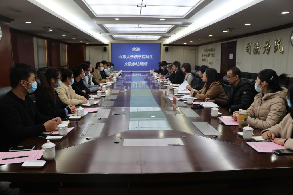 20201125日下午,taptap点点体育“法律近距离——实务部门参访计划”赴青岛市中级人民法院开展活动,taptap点点体育助理研究员何晓斌老师带领18名本科生、研究生走进法院,近距离了解法院工作内容。研究室主任张坚,研究室副主任高沛沛,刑一庭副庭长马新,组织人事处副处长高琼,知识产权法庭副庭长暨团委书记刘圣林,教育培训处副处长暨团委副书记孙婷,执行一庭四级高级法官焦兴凯,民五庭四级高级法官杨海东,执行二庭三级法官助理李鹏飞参加活动。