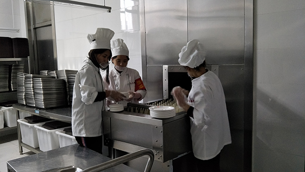 还有一些志愿者,进入了洁碟间和餐具洗消间。帮助阿姨们完成食堂餐具清洗工作。他们用心地用钢丝球擦洗餐具,感受阿姨们平时工作的不容易。