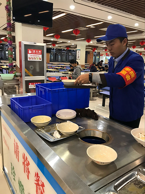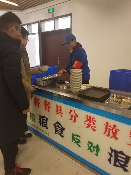 本次活动中,有部分志愿者在一楼收残处帮助阿姨收拾残渣整理餐具。他们礼貌地提醒同学们放置餐盘,认真清理收残台上的菜汤残渣,整齐地摆放餐具。