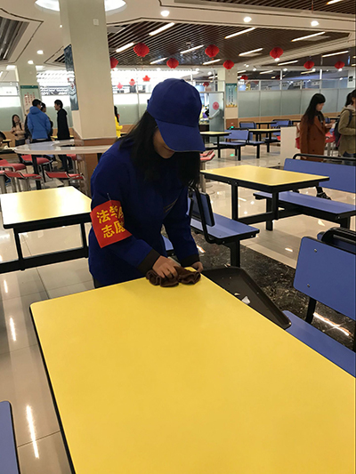 也有志愿者拿起抹布,活动在餐厅一楼的各个餐桌前。他们细心清理掉同学们用餐过后残留在桌上的残渣,擦洗掉餐桌上的菜汤油渍。