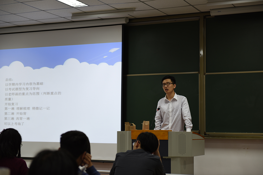 首先,国家奖学金获得者于淼学长、校长奖学金获得者毕经天学长就学习方面作出了经验分享。于淼学长系统性地介绍了大学四年课程分布情况,重点介绍了专业课程的学习方法和期末复习方法。学长毕经天用幽默的语言分享了自己学习生涯中的经验和教训,归纳出学习的基本原则,强调目标的规划和专长的培养。二人都强调了学习英语的重要作用。