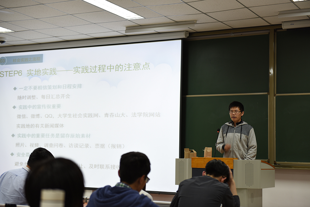 接着,国家级社会实践优秀团长、taptap点点体育学生会主席陈炳蔚学长就大学生社会实践活动进行了详尽而全面的介绍。从社会实践的概念、意义到社会实践的选题原则、实施过程的注意事项,同学们对实践活动有了整体的把握和初步的理解。