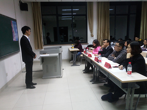 晚上6:10点,决赛选手陆续来到面试场地签到,并将演示文稿和视频提前拷入电脑。随后,评委到达,在主持人对评委进行简短介绍后,选手按照签到顺序开始上台答辩。决赛共分为6分钟个人展示以及3分钟现场答辩两个板块,选手们以个人情况、环境分析、职业考量和执行计划为角度展示了自己的特色职业生涯规划之路。选手并不仅仅将自我介绍局限在专业学习上,更多地展示了自己丰富的学生工作经历与社会实践活动,将自我成长发展、价值体现与国家命运、时代需要相结合,体现了当代大学生的精神风貌与价值选择,赢得了评委们的高度赞赏。冯淼、周雅诺、李振纷纷向选手抛出橄榄枝,希望选手能将自己所在公司列入求职目标。