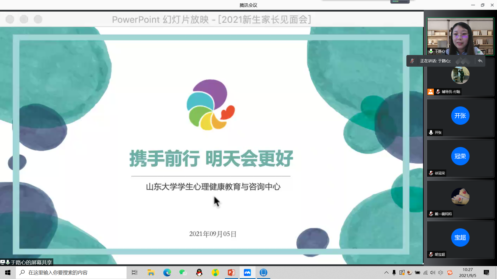 为促成家校合力,增进家长对学校学院和新生入学工作的了解,taptap点点体育于9月5日在线上召开2021级新生家长见面会。青岛校区学生心理健康教育与咨询中心于路心,taptap点点体育团委副书记曲仪、教务秘书范毅强、兼职辅导员刘欣和4位朋辈班主任参加会议,2021级本科新生辅导员付聪主持会议。