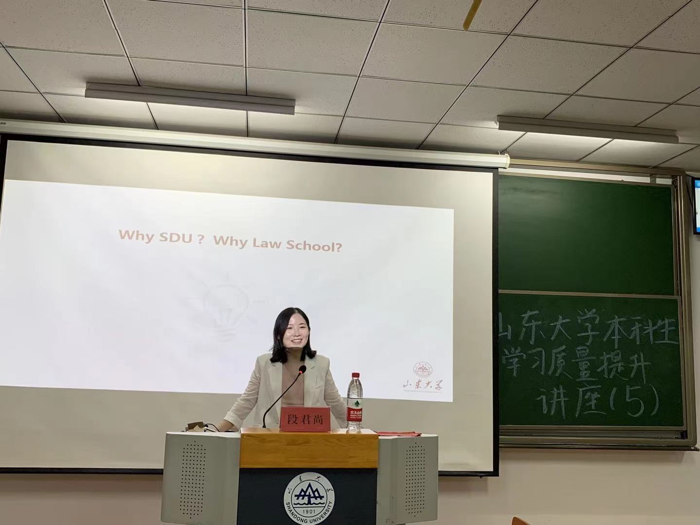 接着,段君尚老师展示了自己交流访学的照片并分析了中外高校在教学方面的差异。段君尚老师认为,国际化的视野和包容的心态,是她在国外留学期间的最大收获。针对同学们在本科毕业后该何去何从这个问题,段君尚老师为同学们介绍了国内读研、申请出国和直接就业三种选择,详细地讲解了公务员、律师等职业的工作内容与具体要求,并详细分析了不同选择的利弊得失,从而加深了同学们对相关职业的认识。她结合自己的亲身体会和与他人交流的获得的经验,建议同学们根据个人实际情况做出适合自己的职业选择。