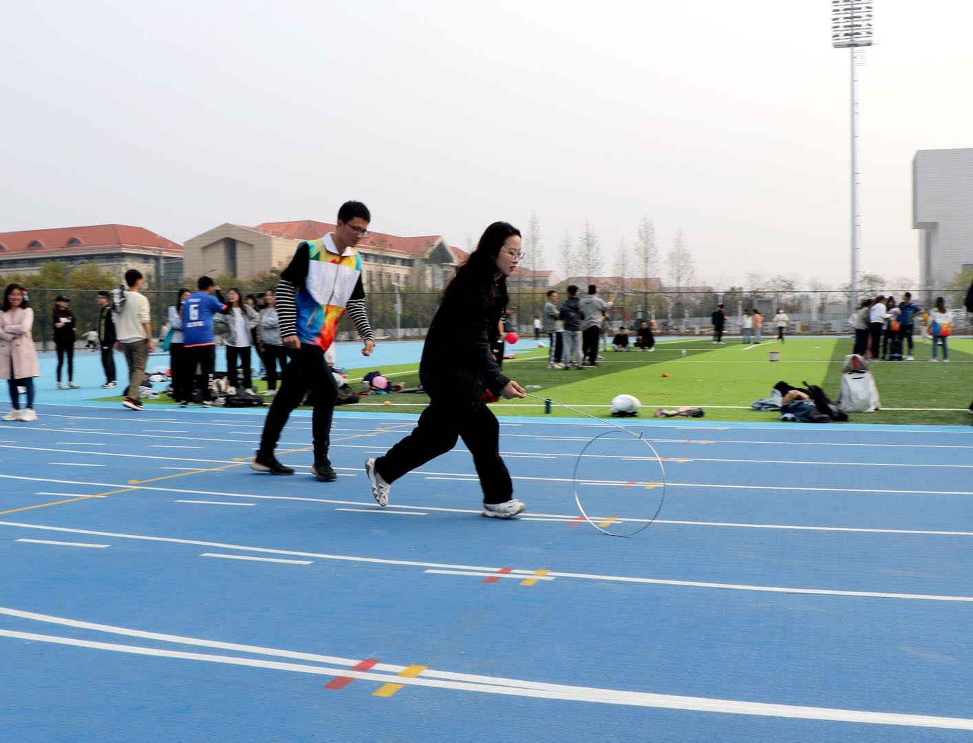 本次接力赛设置了抛绣球、滚铁环、夹气球三项游戏,吸引了来自八个班级的二百多名研究生参加,共计三十支队伍。这一系列充满挑战的游戏运动项目,十分考验参赛同学的默契、速度,让大家在活动中体验合作和互动的乐趣。追逐十月的秋风,我们鼓动着青春的步伐;沐浴秋天的暖阳,我们感受着激情的舞动!